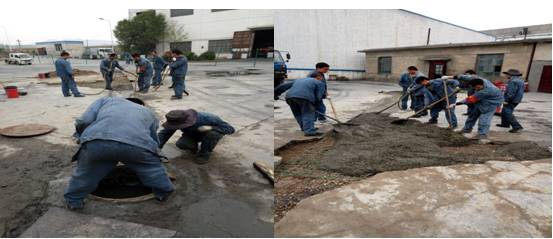 時至夏日,天氣多變。臨時土建維修隊充分發揮車間人員中懂得土建施工技能的優勢,悉心謀劃,從職工家中借用攪拌機等施工機械,加班加點有序進行著屋面防水修復、路面地基處理、排水溝的修復等維修工作。在公司車隊密切配合下,截至6月4日共修復屋面防水358平方米,路面維修290平方米、路基整修87立方米,排水溝修復15米,生產廠區道路破裂,瀝青澆灌等各項工作。