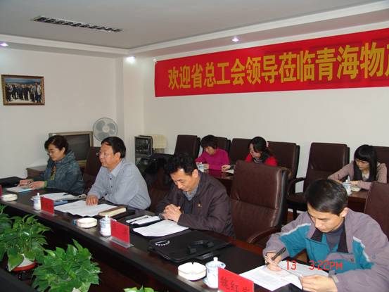 2012年12月13日下午,省總工會第六考核組組長、省總副巡視員兼法律保障部部長李忠云、考核組成員、省總機關黨委專職副書記呂華、考核組成員、省總組織部副調研員姬紅捷、考核組成員、省總經濟部魏紅巖一行蒞臨青海物產集團,對物產工會2012年度工作開展情況進行考核。